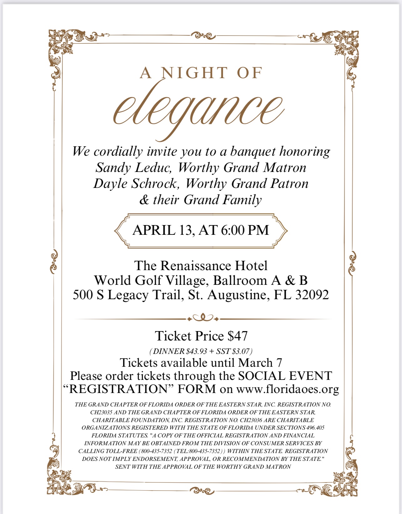 The Grand Chapter of Florida Order of the Eastern Star, Inc. Registration No. CH23035 and The Grand Chapter of Florida Order of the Eastern Star, Charitable Foundation, Inc. Registration No. CH23036 are charitable organizations registered with the State of Florida under Sections 496.405 Florida Statutes. "A COPY OF THE OFFICIAL REGISTRATION AND FINANCIAL INFORMATION MAY BE OBTAINED FROM THE DIVISION OF CONSUMER SERVICES BY CALLING TOLL-FREE (800-435-7352) WITHIN THE STATE. REGISTRATION DOES NOT IMPLY ENDORSEMENT, APPROVAL, OR RECOMMENDATION BY THE STATE."